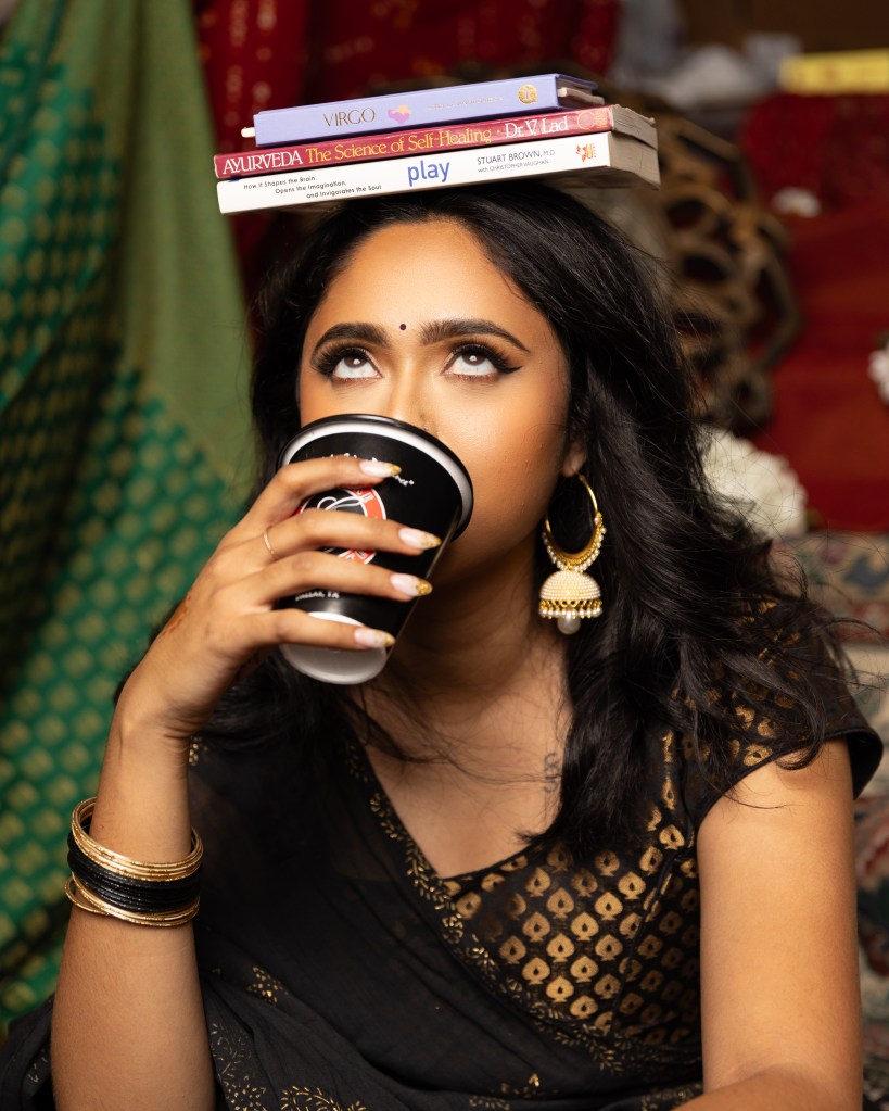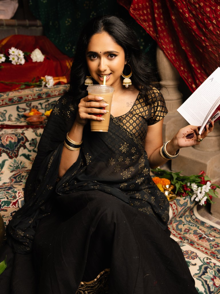 Through curated visuals—featuring flowers, ladoos, pots, mirrors, books, and coffee—I’ve captured the essence of my cultural identity at the intersection of tradition and modernity.